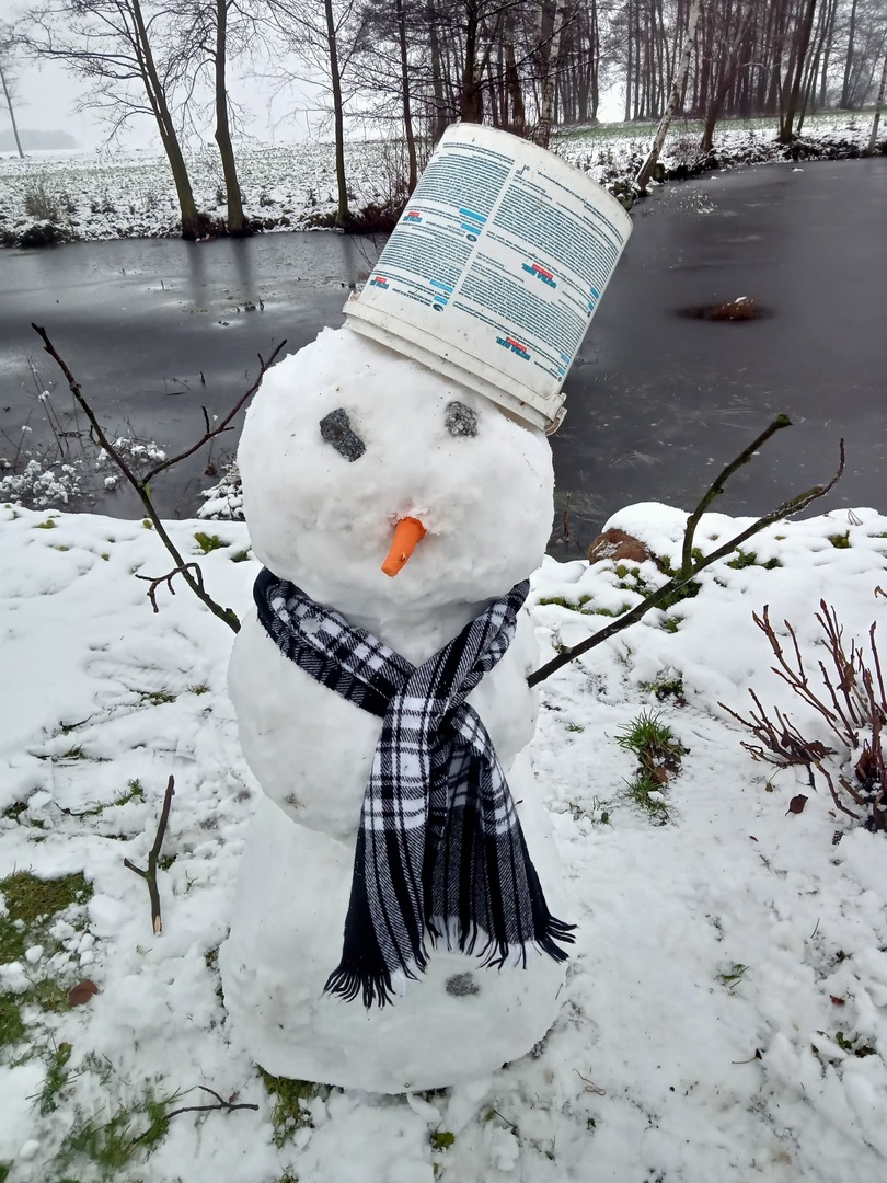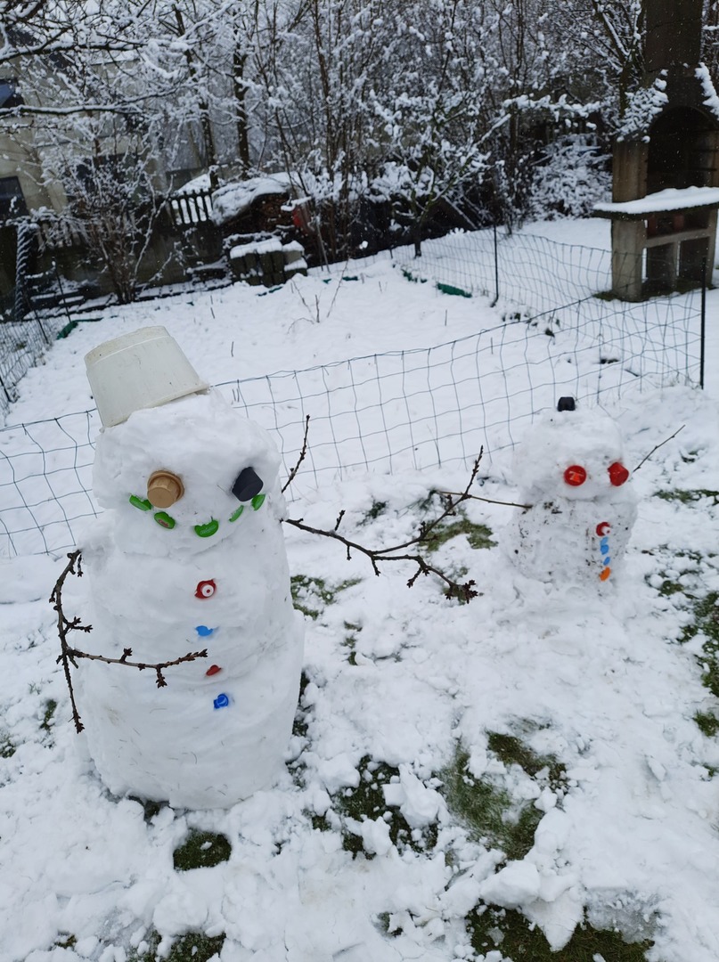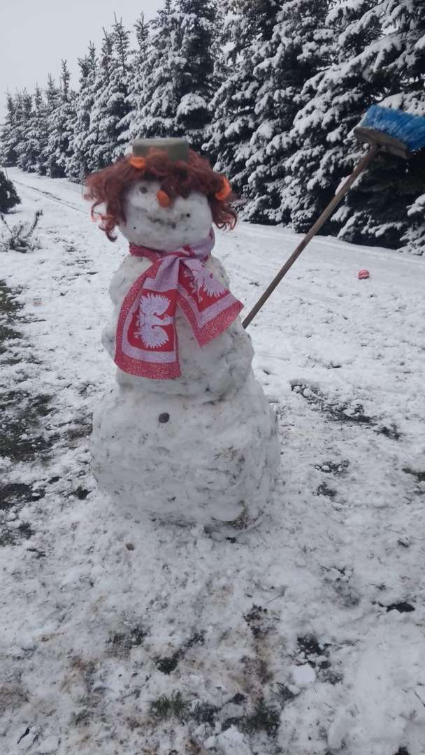 Oczywiście w odpowiednim do pogody ubraniu. Nawet bałwany mają nakrycia głowy.